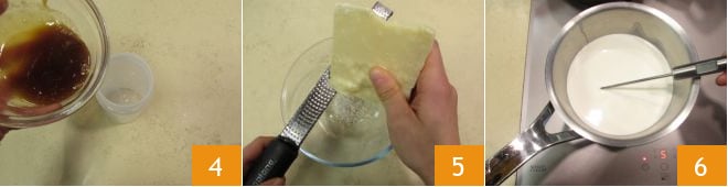 Lassen Sie es dann abkühlen und füllen Sie es in eine Küchenspritze 4. Bereiten Sie nun die Gemüsebrühe vor und stellen Sie sicher, dass sie beim Kochen des Risottos kocht. Gehen Sie zur Grana Padano-Creme über. Reiben Sie den Käse frisch mit einer Zestenreibe 5, nur so erreichen Sie die richtige Endkonsistenz der Creme. Gießen Sie die Sahne in einen kleinen Topf und erhitzen Sie sie auf dem Herd auf etwa 70° 6.