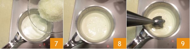 Fügen Sie den geriebenen Grana Padano hinzu 7 und vermischen Sie alles mit einem Schneebesen 8. Wenn der Käse vollständig geschmolzen ist, mixen Sie die Creme mit einem Stabmixer 9. Sobald die richtige Konsistenz erreicht ist, bewahren Sie die Creme in einem Wasserbad bei 60° auf, um sie warm zu halten.