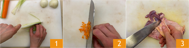 Um den Risotto mit Hof-Ragout zuzubereiten, bereiten Sie zunächst die Fleischbrühe vor (Sie können die Knochen verwenden, die beim Säubern von Huhn und Ente anfallen) und halten Sie sie warm. Kümmern Sie sich um das Ragout: Schälen Sie die Karotte, die Zwiebel und den Sellerie 1, dann hacken Sie sie fein mit dem Messer 2. Entfernen Sie nun die Haut vom Huhn und der Ente 3 und legen Sie sie beiseite.