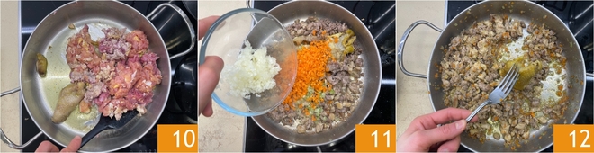Erhöhen Sie die Hitze leicht und braten Sie das Fleisch mindestens 5 Minuten an 10. Sobald es Farbe angenommen hat, fügen Sie das Gemüse des Soffrittos hinzu 11. Reduzieren Sie die Hitze erneut und garen Sie das Soffritto sanft mindestens 10 Minuten lang, indem Sie den Boden der Pfanne mit einem Löffel abkratzen, um alle Aromen zu extrahieren. Sobald das Soffritto gut angebraten ist, entfernen Sie die Haut 12.