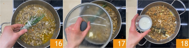 Binden Sie Salbei und Rosmarin zusammen und geben Sie das Kräuterbündel in die Pfanne 16, dann decken Sie den Deckel ab und lassen Sie es bei sehr schwacher Hitze etwa anderthalb Stunden kochen 17, das Fleisch sollte zart und die Sauce eingedickt sein. Nach dieser Zeit gießen Sie die Milch hinzu 18.