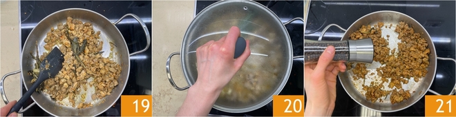Rühren Sie um 19 und setzen Sie das Kochen weitere 30 Minuten fort, immer mit Deckel 20. Am Ende der Garzeit mit Salz und Pfeffer abschmecken 21.