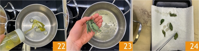 Sie können mit dem Kochen des Risottos fortfahren: Schmelzen Sie in einem Topf die Butter im Öl 22, dann fügen Sie die Salbeiblätter hinzu 23 und braten sie für einen Moment an. Wenn sie sich gekräuselt haben und ihre Farbe geändert haben, legen Sie sie auf saugfähiges Papier und halten Sie sie beiseite 24.