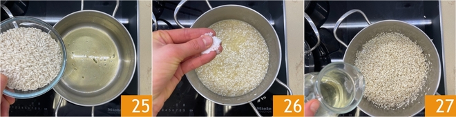 In dasselbe Kochfett geben Sie den Reis 25, salzen Sie 26 und rösten ihn 1-2 Minuten bei mittlerer Hitze an. Wenn die Körner sehr heiß auf der Haut sind, löschen Sie mit Weißwein ab 27.