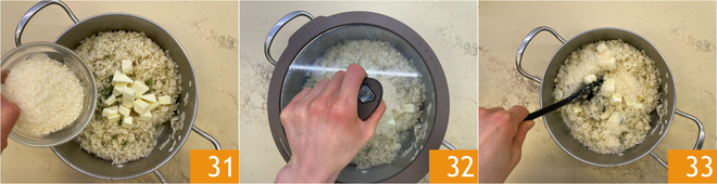 Kochen Sie den Reis, indem Sie ihn jedes Mal mit einer Kelle heißer Brühe beträufeln und gelegentlich umrühren 28. Sobald er fertig ist 29, nehmen Sie den Topf vom Herd und duften ihn mit Thymian, dann verfeinern Sie mit der kalten Butter 30.