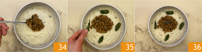 Richten Sie den Risotto an und geben Sie das Ragout in die Mitte 34, dann garnieren Sie mit den knusprigen Salbeiblättern und Pfeffer nach Belieben 35. Ihr Risotto mit Hof-Ragout ist bereit zum Servieren 36!