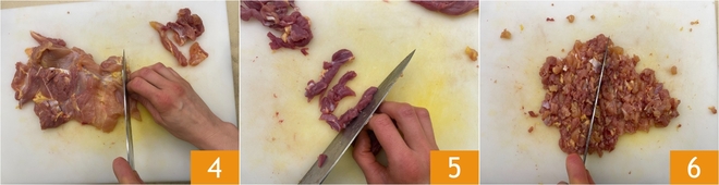 Hacken Sie die Hühnerschenkel 4 und Entenschenkel 5 mit dem Messer, achten Sie darauf, eventuelle Sehnen und Knorpel zu entfernen: Es ist nicht notwendig, gleichmäßige Stücke zu erhalten, wichtig ist, dass sie klein sind 6.