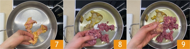 Legen Sie die Haut von Huhn und Ente in eine Stahlpfanne, schalten Sie das Feuer ein 7 und lassen Sie sie bei schwacher Hitze schwitzen; falls nötig, können Sie einen Schuss Öl hinzufügen. Wenn die Haut einen schönen Fettboden abgegeben hat, geben Sie das gehackte Entenfleisch 8 und das Hühnerfleisch 9 hinzu.
