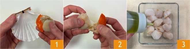 Um das Risotto mit Jakobsmuscheln und Zitrusfrüchten zuzubereiten, befreien Sie zuerst die Frucht aus der Schale 1, trennen den Rogen von der Muschel 2 und legen sie beiseite. Geben Sie die Muscheln in eine Schüssel und würzen Sie sie mit Öl 3.