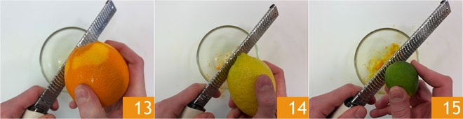 Reiben Sie die Schale der Orange 13, der Zitrone 14 und der Limette 15.