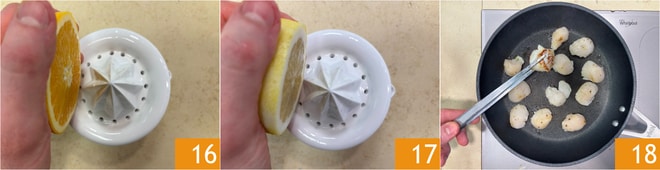 Pressen Sie den Saft der Orange 16 und der Zitrone 17. Erhitzen Sie eine beschichtete Pfanne gut und braten Sie die Jakobsmuscheln 30 Sekunden pro Seite 18.