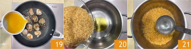 Löschen Sie mit Orangensaft und Zitronensaft ab 19. Stellen Sie die Jakobsmuscheln und den Bratensatz beiseite. Geben Sie in einen Topf einen Schuss Öl, fügen Sie den Reis hinzu 20 und rösten Sie ihn einige Minuten. Löschen Sie mit Prosecco ab und wenn der gesamte Alkohol verdampft ist, gießen Sie mit leicht gesalzenem Wasser 21 oder mit Fischbrühe auf. Geben Sie eine Kelle Wasser hinzu, wenn die vorherige vom Reis aufgenommen wurde, und bringen Sie ihn zur Garung.