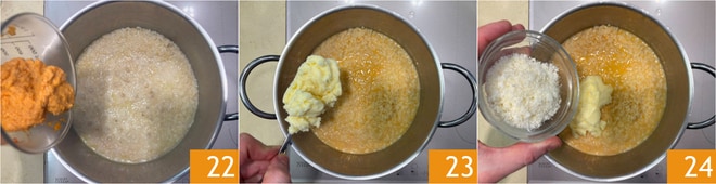 Wenn noch 5 Minuten bis zum Ende der Garzeit fehlen, fügen Sie die Rogencreme hinzu 22. Sobald der Reis gar ist, schalten Sie die Hitze aus, fügen Sie die Butter 23 und den Parmesan 24 hinzu.