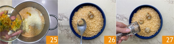 Fügen Sie auch die Zitrusschalen hinzu 25 und verfeinern Sie. Anrichten, die Jakobsmuscheln auf die Oberfläche des Risottos legen 26 und mit einer Prise schwarzem Pfeffer 27 bestreuen.
