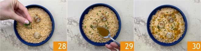 Vervollständigen Sie mit frisch gehacktem Schnittlauch 28 und dem Bratensatz der Jakobsmuscheln 29. Das Risotto mit Jakobsmuscheln und Zitrusfrüchten ist bereit zum Servieren 30!