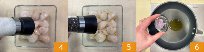 Würzen Sie mit Salz 4 und Pfeffer 5. Mischen Sie vorsichtig und lassen Sie es 20 Minuten im Kühlschrank ruhen. Geben Sie in eine Pfanne das Öl, fügen Sie die Schalotten hinzu 6 und lassen Sie sie goldbraun werden.