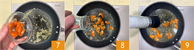Fügen Sie die Rogen hinzu 7, gießen Sie mit einem Glas Wasser auf 8 und kochen Sie eine Minute. Schmecken Sie mit Salz ab 9.