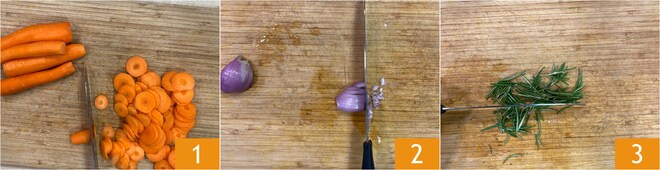 Um das Risotto mit Karotten und Brotkrümeln zuzubereiten, beginnen Sie damit, die Karotten zu schälen und in dünne Scheiben zu schneiden 1. Die Schalotte 2 und den Rosmarin 3 fein hacken.