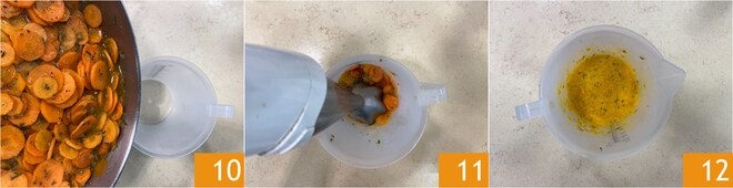 Die Karotten in ein hohes Gefäß geben 10 und mit einem Stabmixer pürieren 11, bis eine Creme entsteht 12. Falls nötig, noch etwas Brühe hinzufügen.