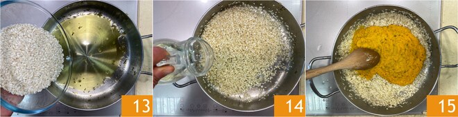 In demselben Topf, in dem Sie die Karotten gekocht haben, etwas Öl erhitzen und den Reis anrösten 13. Mit dem Weißwein ablöschen 14. Sobald der Wein verdampft ist, die Karottencreme hinzufügen 15.