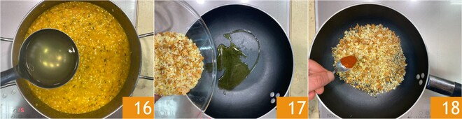 Nun den Reis etwa 15-20 Minuten weiterkochen und bei Bedarf weitere Brühe hinzufügen 16. In der Zwischenzeit die Brotkrümel vorbereiten: Das altbackene Brot im Mixer zerkleinern, um grobe Krümel zu erhalten. In einer Pfanne einen Schuss Öl, die Brotkrümel 17 und das Paprika 18 zugeben.
