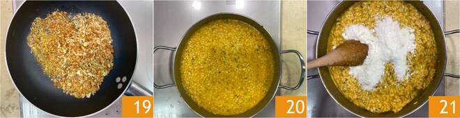 Die Krümel bis zur Bräunung rösten und beiseite stellen 19. Wenn der Reis gar ist 20, die Hitze ausschalten und mit dem Pecorino 21 cremig rühren.