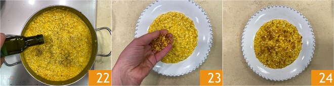 Einen Schuss Öl 22 hinzufügen und gut umrühren, dann mit Salz und Pfeffer abschmecken. Die Teller mit dem gerösteten Brot 23 garnieren. Das Risotto mit Karotten und Brotkrümeln ist servierfertig 24!