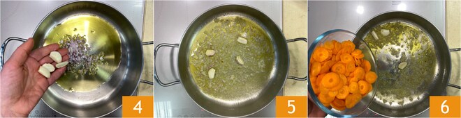 In einem Topf etwas Öl, die Schalotte und die geschälten Knoblauchzehen 4 geben und bei schwacher Hitze andünsten 5, dann die Karotten hinzufügen 6.