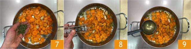 Mit dem gehackten Rosmarin würzen 7. Die Karotten salzen und pfeffern 8 und etwa 10 Minuten unter Zugabe von ein oder zwei Kellen Brühe kochen 9. Am Ende der Kochzeit den Knoblauch entfernen.