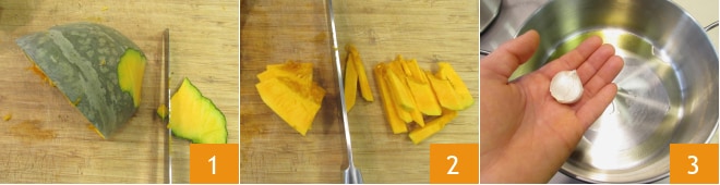 Um das Risotto Kürbis und Speck zuzubereiten, bereiten Sie zunächst die Gemüsebrühe vor und halten Sie diese warm. Putzen Sie den Kürbis, indem Sie die inneren Samen entfernen und die Schale mit einem Messer abziehen 1, dann schneiden Sie ihn grob in Stücke 2. Erhitzen Sie in einem Topf einen Schuss Öl zusammen mit einer ungeschälten Knoblauchzehe 3.