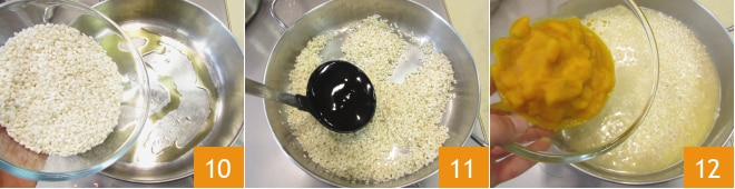 Jetzt rösten Sie den Reis in einem anderen Topf mit einem Schuss Öl an 10, dabei häufig umrühren. Wenn er opaleszent wird, fügen Sie eine Kelle Brühe hinzu 11 und den Kürbis 12.