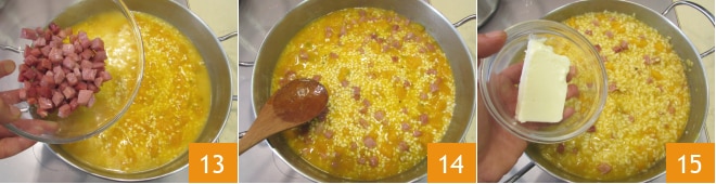 Fügen Sie auch den Speck hinzu 13 und kochen Sie den Reis weiter, indem Sie jeweils eine Kelle Brühe hinzufügen und häufig umrühren 14. Wenn der Reis gar ist, nehmen Sie den Topf vom Herd oder schalten Sie ihn aus und verfeinern Sie ihn mit der Butter 15.