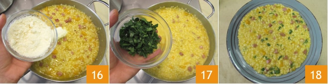 Fügen Sie auch den geriebenen Grana Padano DOP hinzu 16 und vermischen Sie gut. Abschließend mit gehackter Petersilie garnieren 17. Ihr Risotto Kürbis und Speck ist bereit, heiß serviert zu werden 18!