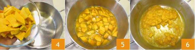 Fügen Sie den Kürbis hinzu 4 und braten Sie ihn eine Minute lang an, dann bedecken Sie ihn mit der Brühe 5 und kochen Sie ihn etwa 20 Minuten, bis er sehr weich ist 6. Sobald er gar ist, entfernen Sie den Knoblauch und stellen Sie ihn beiseite.