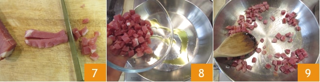 Schneiden Sie den Speck in Würfel 7, dann braten Sie ihn in einer Pfanne mit einem Schuss Öl an, bis er knusprig ist 89.