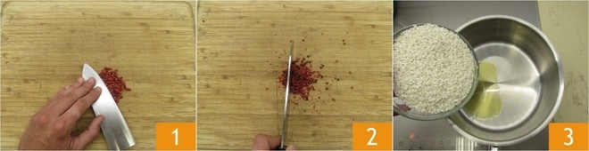 Um das Risotto mit Mascarpone und rosa Pfeffer zuzubereiten, erhitzen Sie zuerst die Gemüsebrühe. In der Zwischenzeit zerdrücken Sie die rosa Pfefferkörner, indem Sie mit der Messerklinge darauf drücken 1, und hacken Sie sie dann 2. In einem breiten Topf geben Sie etwas Öl und lassen es warm werden. Dann fügen Sie den Reis hinzu 3.