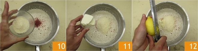 Geben Sie auch den geriebenen Grana 10, die Butter 11 und die geriebene Zitronenschale 12 hinzu.