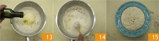 Fügen Sie schließlich einen Schuss Öl hinzu 13, rühren Sie kräftig um 14 und servieren Sie 15.