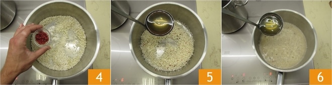 Geben Sie auch eine Prise Salz und die Hälfte des rosa Pfeffers hinzu 4. Rösten Sie den Reis an und rühren Sie häufig um. Jetzt beginnen Sie mit dem eigentlichen Kochen des Risottos. Gießen Sie die Brühe hinzu 5, bis der Reis bedeckt ist. Setzen Sie das Kochen auf diese Weise fort und fügen Sie bei Bedarf Brühe hinzu 6. Der Reis muss immer leicht köcheln und Sie sollten ihn oft umrühren.