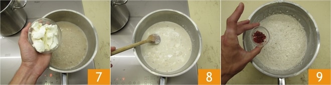 Etwa zur Hälfte der Garzeit fügen Sie den Mascarpone hinzu 7 und rühren weiter um 8, wobei Sie jeweils wenig Brühe hinzufügen. Nach der Garzeit schalten Sie die Hitze aus und lassen den Reis ein paar Minuten ruhen, bevor Sie mit dem Mantecare beginnen. Fügen Sie als Erstes den restlichen rosa Pfeffer hinzu 9.