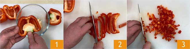 Um den Risotto mit süßen Paprika und Sardellen-Crumble zuzubereiten, reinigen Sie zuerst die Paprika: Entfernen Sie die Samen und inneren Fasern 1 und schneiden Sie das Fruchtfleisch erst in Streifen 2 und dann in kleine Würfel 3.