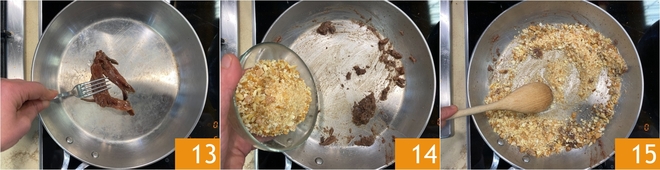 In der Zwischenzeit lassen Sie die Sardellen in einer anderen Pfanne schmelzen, indem Sie sie mit einer Gabel zerdrücken 13. Sobald sie geschmolzen sind, fügen Sie die Brösel von altbackenem Brot hinzu 14 und rösten Sie sie etwa 5 Minuten bei mittlerer bis hoher Hitze, unter häufigem Rühren 15.