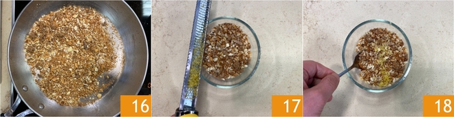 Wenn sie goldbraun und knusprig geworden sind 16, würzen Sie mit der abgeriebenen Zitronenschale 17 und mischen Sie 18. Beiseite stellen.