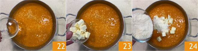 Nach 10 Minuten Kochzeit des Reises die Paprikacreme hinzufügen 19 und gut vermischen 20. Die Kochzeit des Reises für weitere 4 Minuten fortsetzen 21, dann die Hitze ausschalten.