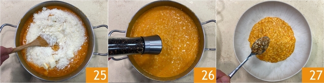 Abseits der Hitze den Risotto mit dem Essig 22, kalten Butterwürfeln 23 und geriebenem Parmigiano Reggiano DOP 24 mischen.