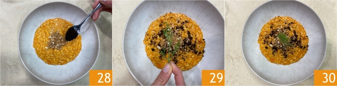 Zuletzt mit verbrannter Zitronenpulver 28, noch etwas mehr abgeriebener Zitronenschale und einem Zweig Dill 29 garnieren. Ihr Risotto mit süßen Paprika und Sardellen-Crumble ist bereit zum Servieren 30!