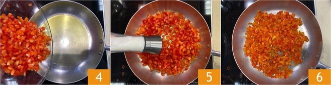 Geben Sie die Paprika in eine Pfanne mit einem Schuss heißem Öl 4, salzen 5, pfeffern Sie und kochen Sie bei schwacher Hitze etwa 30 Minuten lang 6.