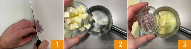 Um den Risotto mit Äpfeln und Gorgonzola zu zubereiten, beginnen Sie mit der sauren Butter. Schneiden Sie die Schalotte fein 1. Lassen Sie die Butter in einem kleinen Topf schmelzen 2 und fügen Sie die Schalotte hinzu 3.
