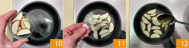 Lassen Sie in einer Pfanne etwas Butter schmelzen, fügen Sie die Apfelscheiben hinzu 10 und würzen Sie mit Salz 11 und Pfeffer. Sautieren Sie bei mittlerer Hitze für 3 Minuten. Fügen Sie auch den Honig hinzu 12.