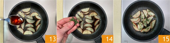 Löschen Sie mit Rotweinessig ab 13. Fügen Sie den Thymian hinzu 14 und schalten Sie die Hitze aus. Beiseite stellen, sie werden für das Anrichten benötigt 15.